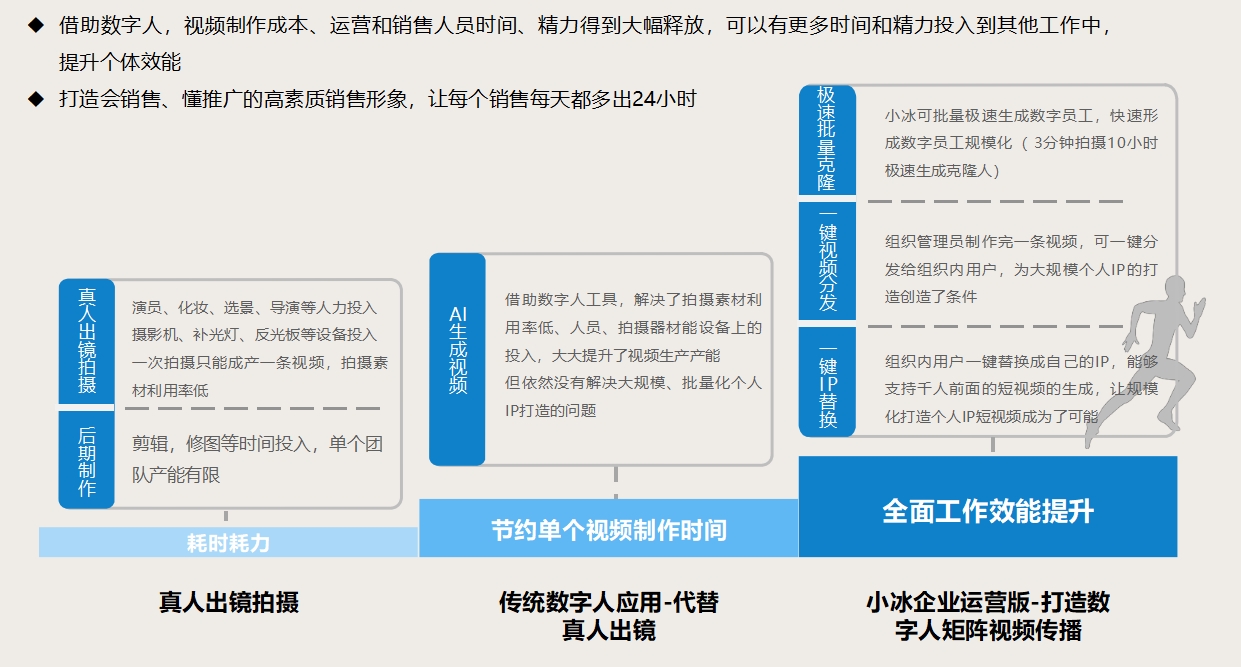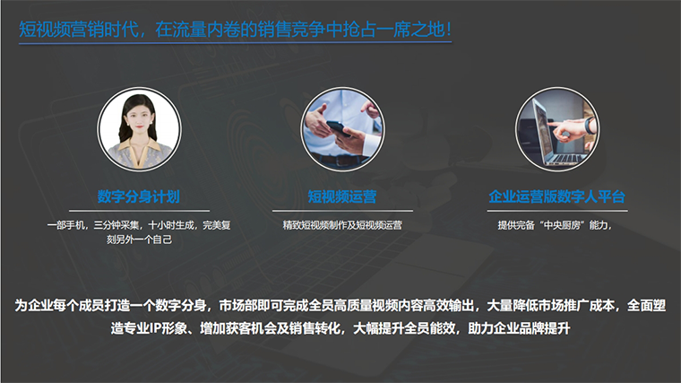 企業智能版數字人是在AI數字人的基礎上專為公司設計的一款產品。企業智能版數字人為企業每個成員打造一個數字分身,結合“一鍵制作”的管理系統,快速制作出每個成員的數字視頻,減少傳統制作視頻所需時間和費用,以其“中央廚房”的系統優勢為企業吸引銷售人才,讓銷售和宣傳并行,節省市場推廣成本,解決銷售私域&公域潛在客戶觸達率低的問題。